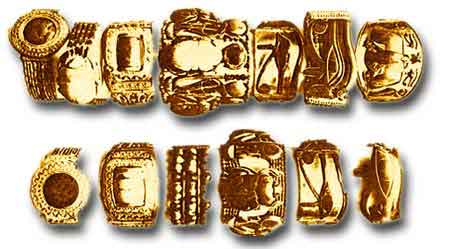 | Der Goldene Hut von Schifferstadt, und die Totenmasken von Mykene und Tut-ench-Amun entstanden vermutlich alle Mitte des 14. Jhdt. B.C. | |||||||||||||